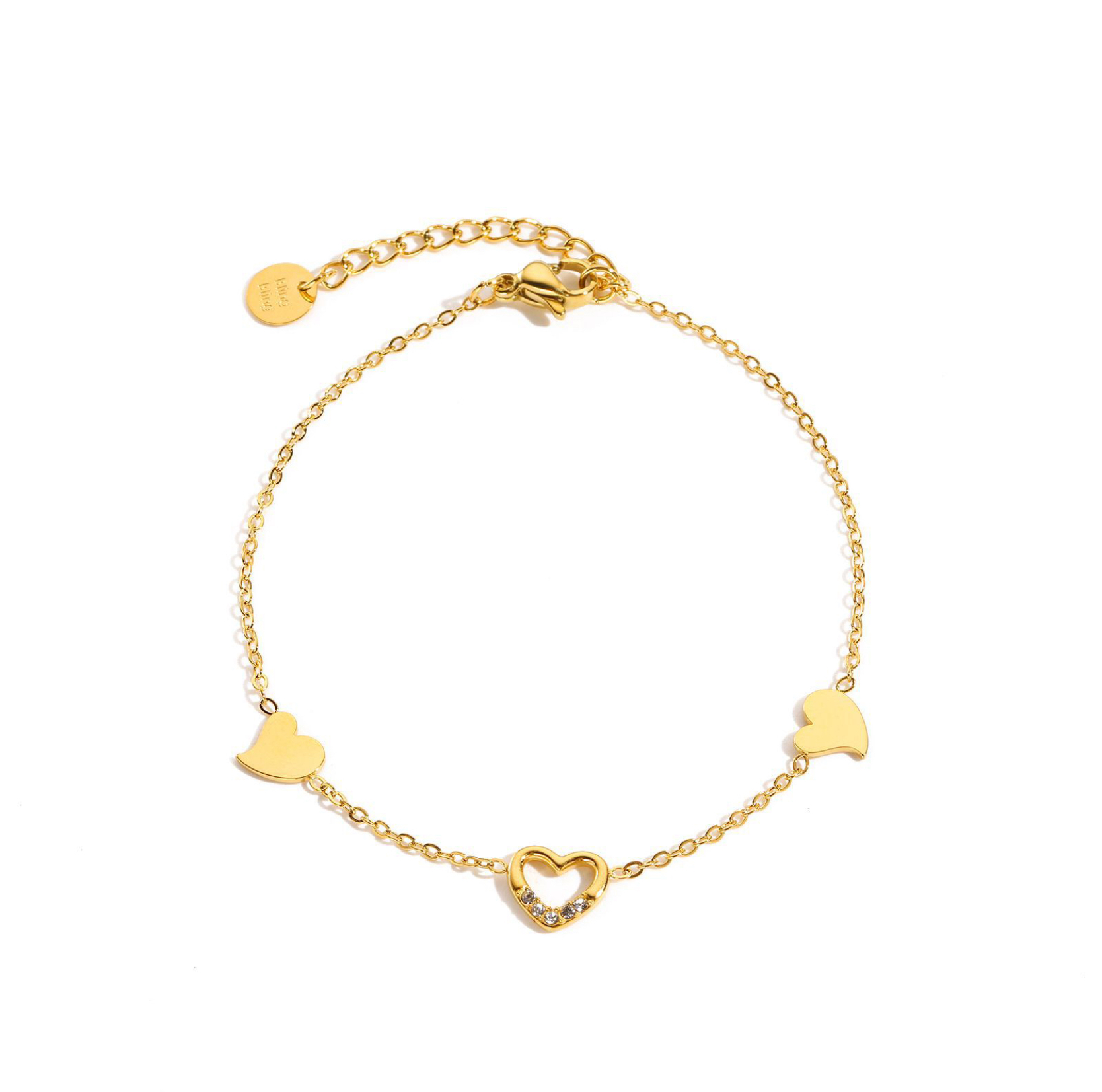 Questo elegante bracciale è realizzato in acciaio inossidabile di alta qualità, noto per la sua resistenza alla corrosione e la sua durabilità. Il design raffinato presenta una catena sottile con tre charm a forma di cuore, disposti in modo uniforme lungo la catena. Due dei cuori sono pieni, mentre il cuore centrale è aperto e impreziosito da piccoli zirconi incastonati su un lato. La chiusura regolabile con estensione a catena garantisce una vestibilità comoda e sicura, mentre il piccolo tag rotondo alla fine della catena aggiunge un tocco di personalità. Perfetto per aggiungere un tocco di eleganza e romanticismo a qualsiasi outfit, questo bracciale è l’accessorio ideale per ogni occasione.