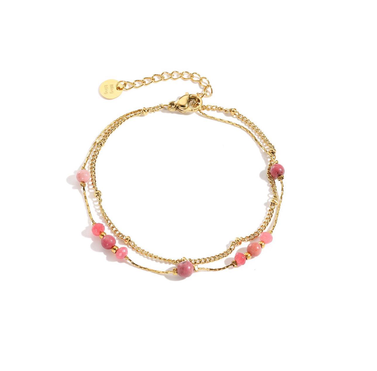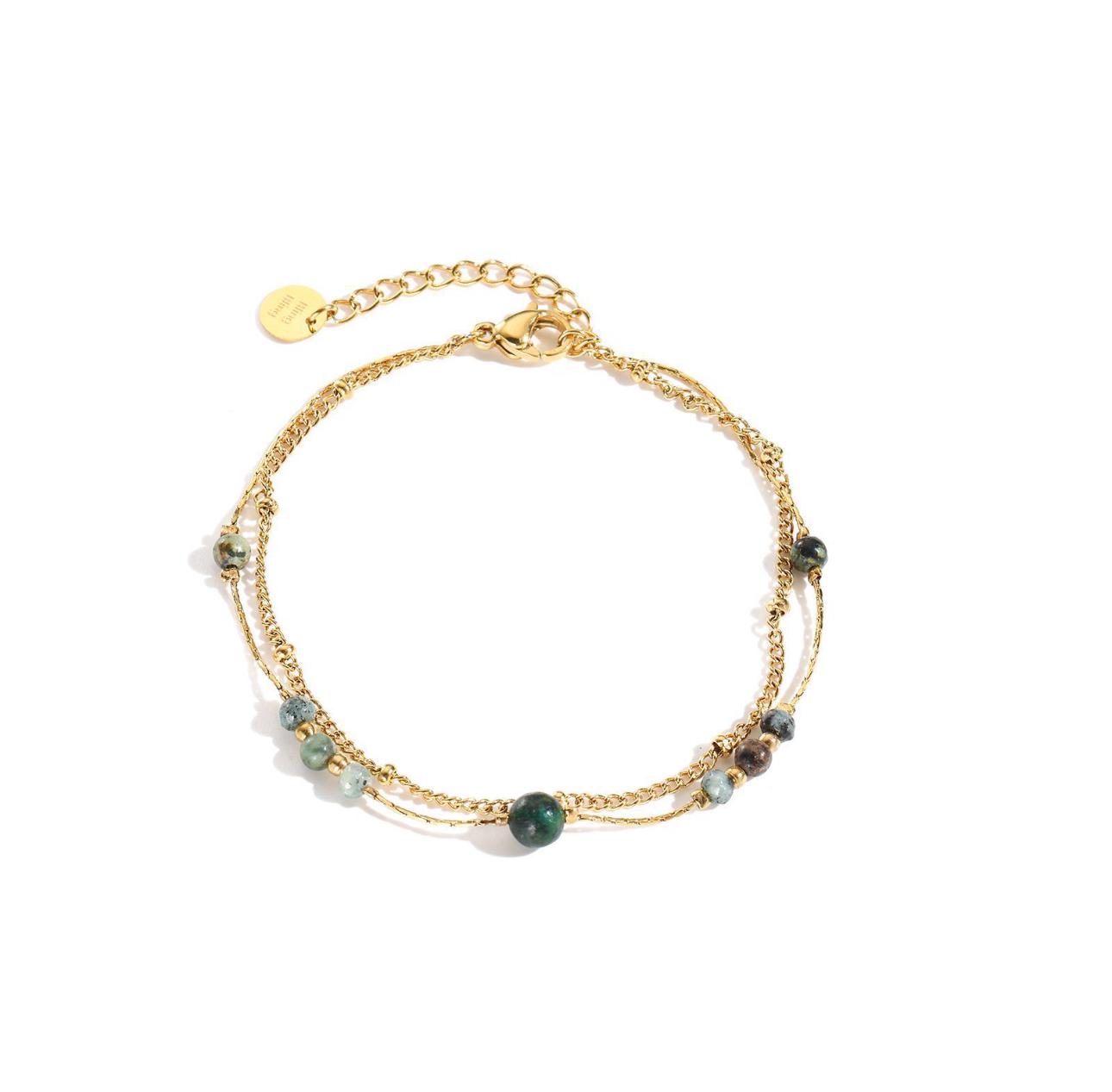 Bracciale raffinato composto da due catene sottili in acciaio inossidabile placcato in oro 18k. Una delle due รจ impreziosita da piccole pietre naturali, che aggiungono un tocco autentico e luminoso, con leggere variazioni di colore che rendono ogni bracciale unico.