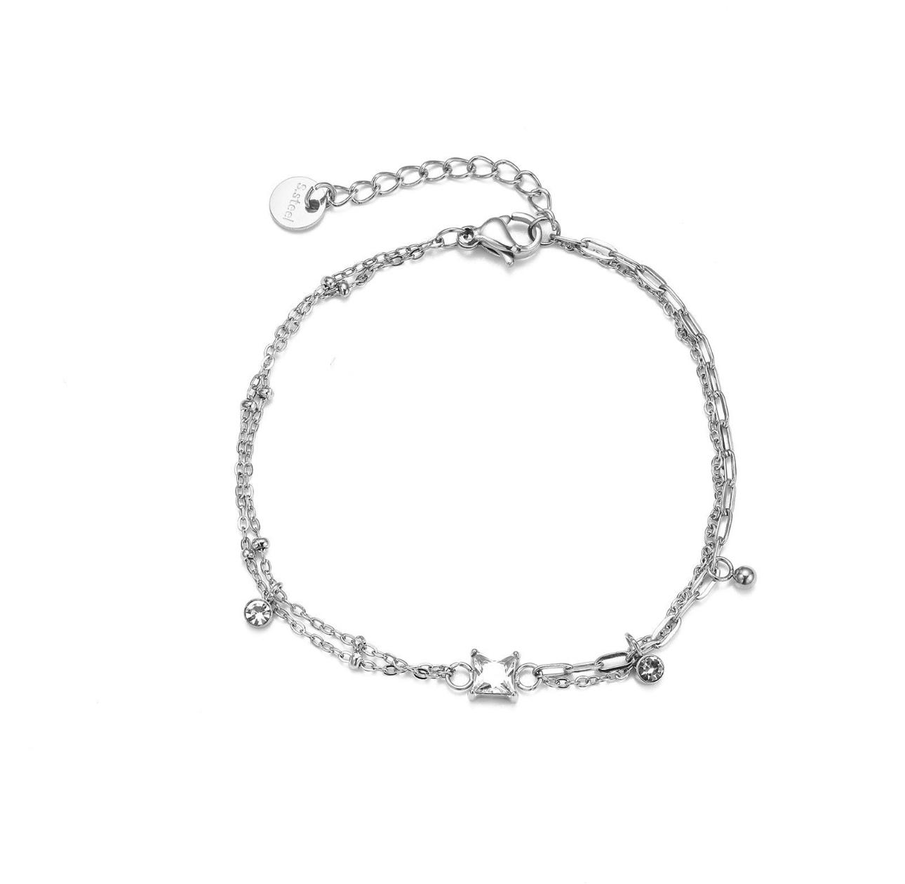 Bracciale realizzato in acciaio inossidabile di alta qualità, disponibile anche nella versione dorata con placcatura in oro 18 carati. Il materiale è resistente all’acqua, ipoallergenico e non si annerisce, garantendo brillantezza e comfort anche con un uso quotidiano. Il design è composto da una doppia catena sottile che crea un raffinato effetto a strati sul polso, impreziosita da un piccolo zircone luminoso che dona un tocco di eleganza discreta. Un accessorio leggero e versatile, ideale per valorizzare ogni look con un dettaglio scintillante e curato.