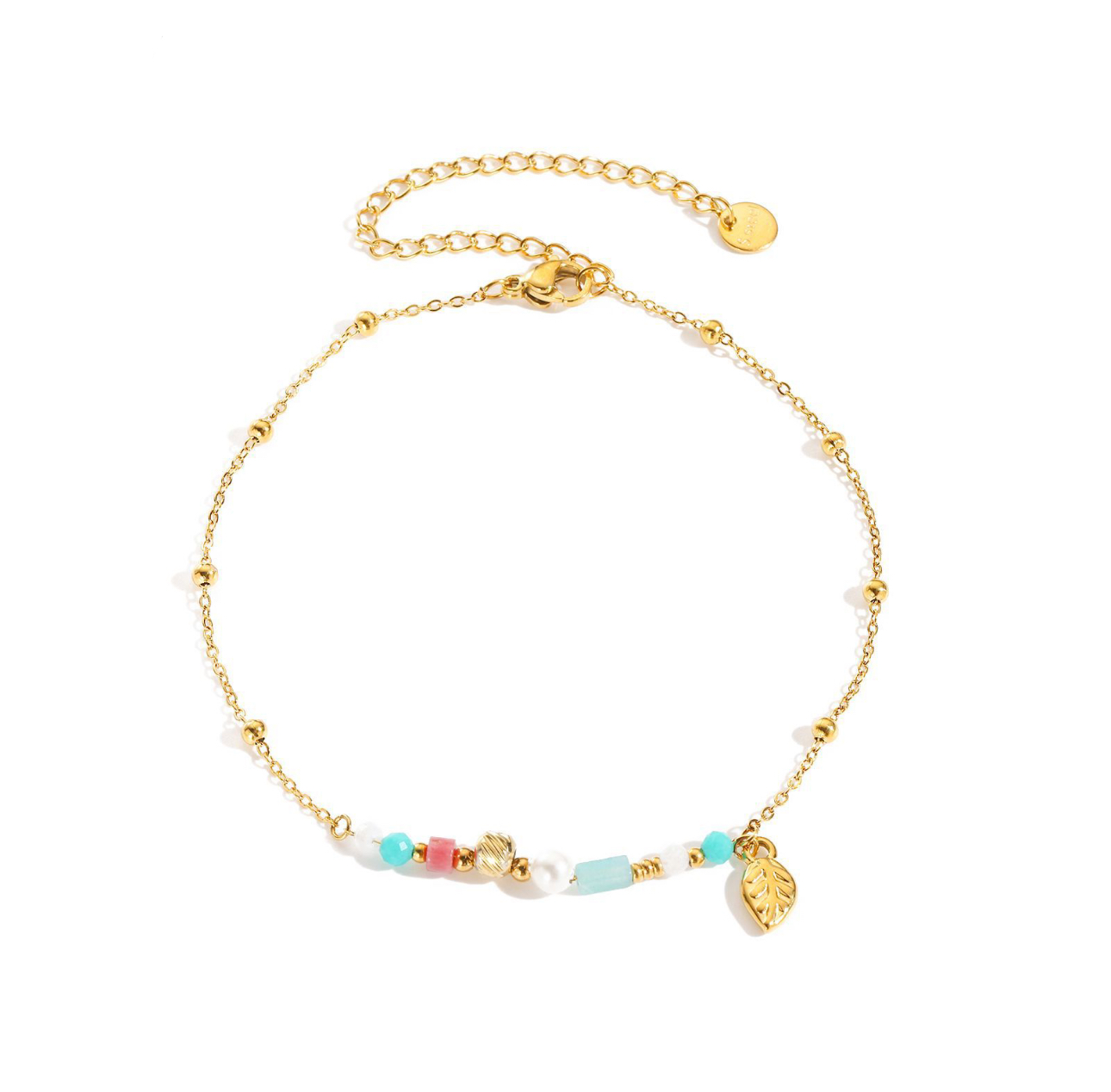 Questa cavigliera, realizzata in acciaio inossidabile placcato in oro 18K, unisce resistenza ed eleganza. Il design sofisticato include un pendente a forma di foglia e pietre naturali, caratterizzate da colori vivaci che attirano l’attenzione e conferiscono un tocco di unicità. La cavigliera è regolabile per adattarsi perfettamente a qualsiasi caviglia. Grazie alle proprietà dell’acciaio inossidabile, è resistente all’acqua, ipoallergenica e non si annerisce, mantenendo la sua brillantezza nel tempo.