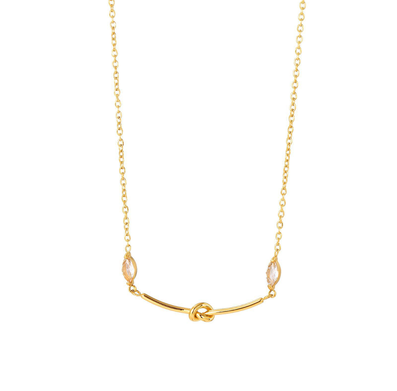 Questa collana elegante รจ realizzata in acciaio inossidabile, con una catena sottile e delicata. Al centro della collana, un elemento decorativo curvo con un nodo centrale รจ adornato da due zirconi, posizionati ai lati del nodo. Questo design non solo aggiunge un tocco di brillantezza e sofisticazione, ma simboleggia anche l’eternitร del legame e la connessione profonda tra due persone, rendendo questa collana il regalo perfetto per San Valentino. La versione dorata รจ realizzata in acciaio inossidabile placcato in oro 18k, conferendo un’ulteriore nota di lusso. La collana รจ regolabile, permettendo di adattarla perfettamente alla misura desiderata.