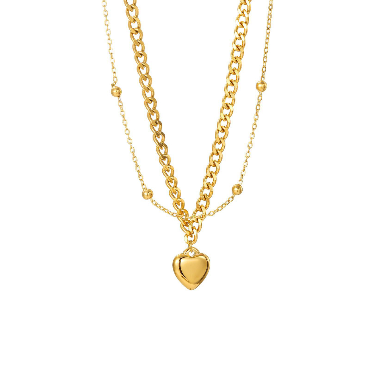• Design: Collana doppia con una catena sottile e una con maglie più spesse, pendente a forma di cuore, chiusura regolabile con estensione a catena