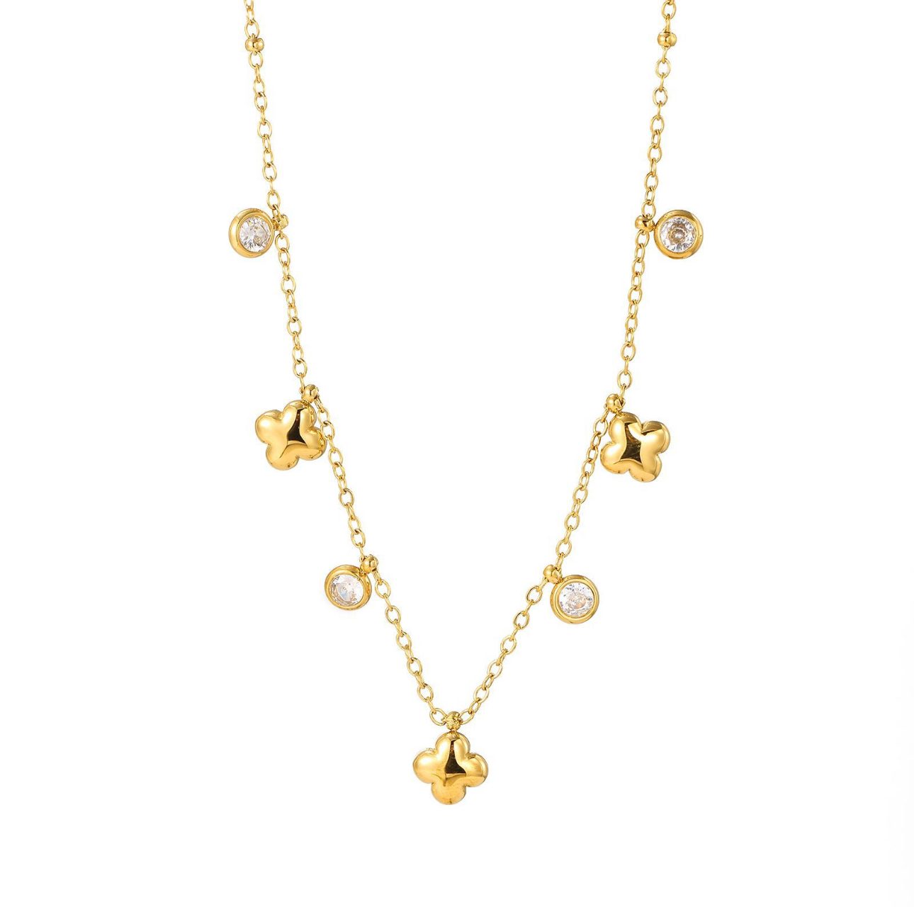 Questa raffinata collana è realizzata in acciaio inossidabile di alta qualità, disponibile anche nella versione dorata placcata in oro 18K. Il suo design elegante è impreziosito da un ciondolo a forma di quadrifoglio, decorato con zirconi che ne esaltano la brillantezza. Il quadrifoglio è simbolo di fortuna e positività, rendendo questa collana non solo un accessorio sofisticato ma anche un gioiello dal significato speciale. Grazie ai materiali di alta qualità, la collana è resistente all’acqua, ipoallergenica e non si annerisce, mantenendo nel tempo la sua bellezza. La chiusura a moschettone con catena regolabile assicura comfort e praticità, permettendo di adattarla facilmente a qualsiasi misura.