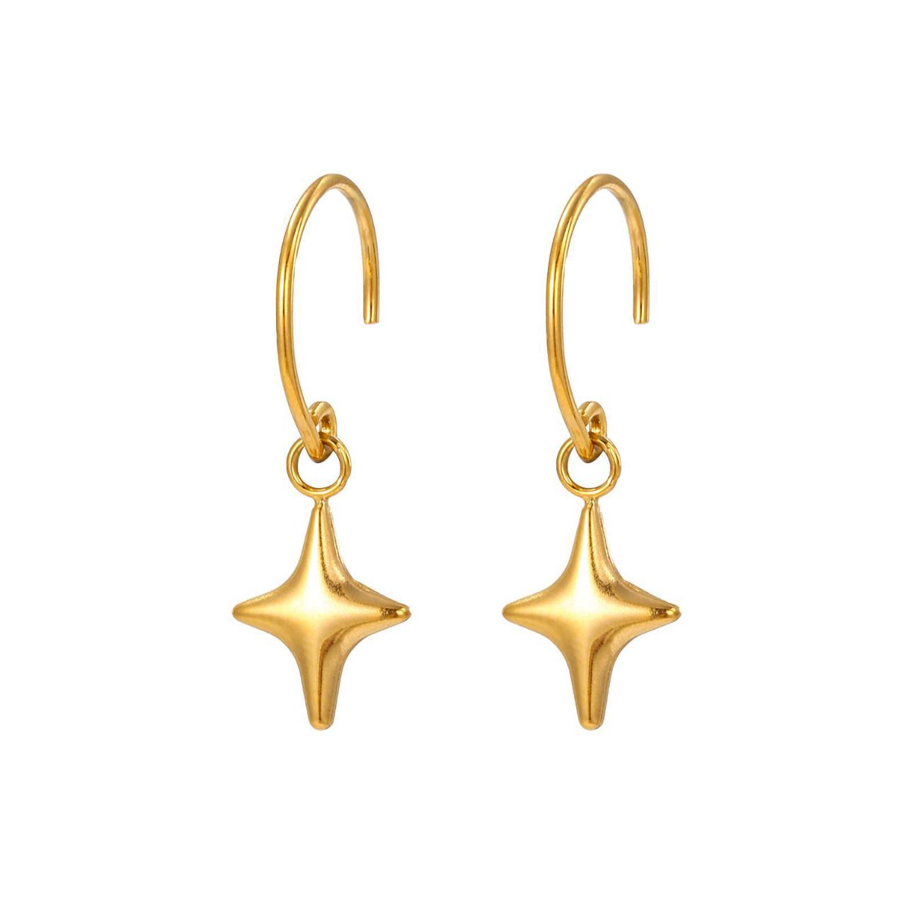 Il design presenta un gancio semplice da cui pende un charm a forma di stella a quattro punte, con una superficie liscia e lucida che riflette la luce a ogni movimento. Questo motivo minimalista e sofisticato rende questi orecchini un accessorio versatile, adatto per diverse occasioni, dall’eleganza quotidiana agli eventi speciali.