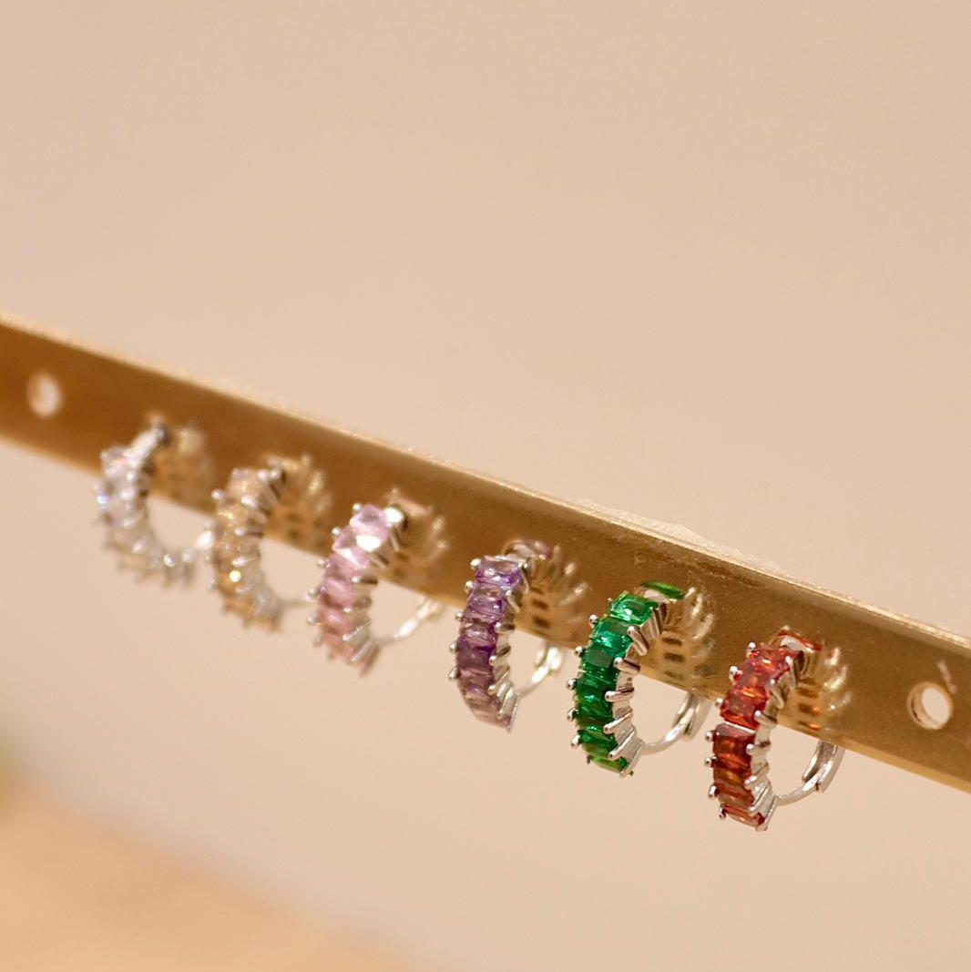 Orecchino singolo in acciaio inossidabile di alta qualità, impreziosito da zirconi rettangolari di vari colori che riflettono la luce con brillantezza, creando un effetto vivace e raffinato. Il design moderno e colorato lo rende un accessorio perfetto per aggiungere un tocco di luce e personalità a qualsiasi look.